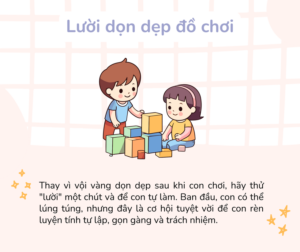 Nghe có vẻ ngược đời nhỉ? Nhưng các mẹ ơi, "lười" ở đây không phải là lười biếng, mà là "lười" làm những việc thay con có thể tự làm được.